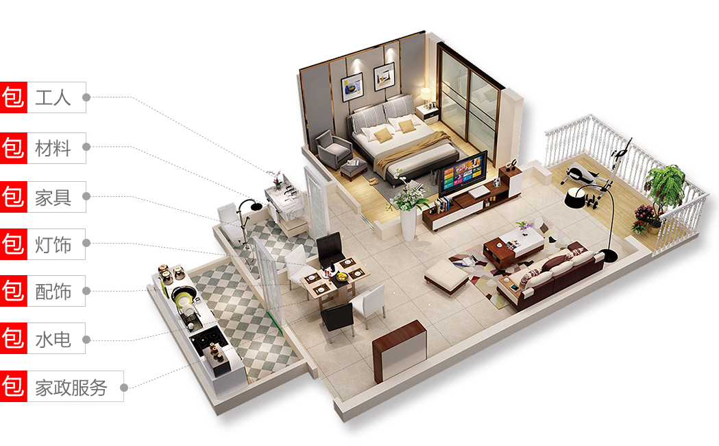 硬裝平米計價+軟裝模塊計價。項目清晰,費用明了。半包、全包,后期0增項。