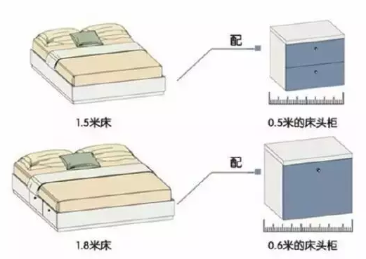 要根據(jù)床的大小而定,1500mm的床放500mm左右的床頭柜,1800mm的床需要放600mm寬以上,高度略低于床面就是最合適的。